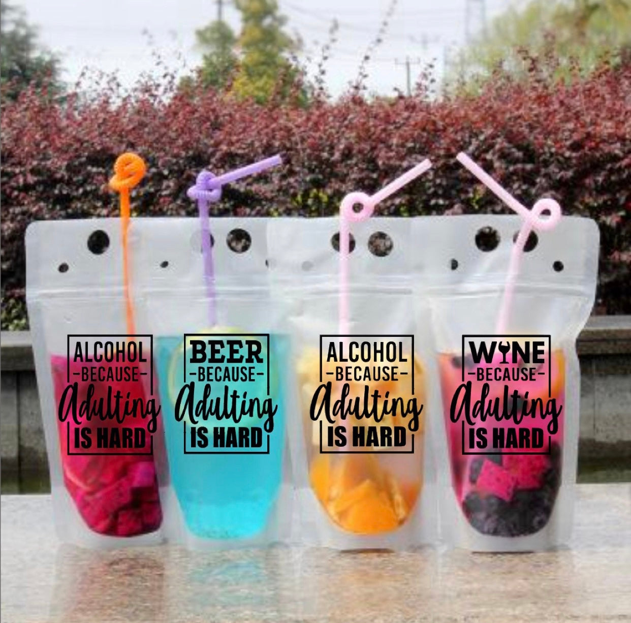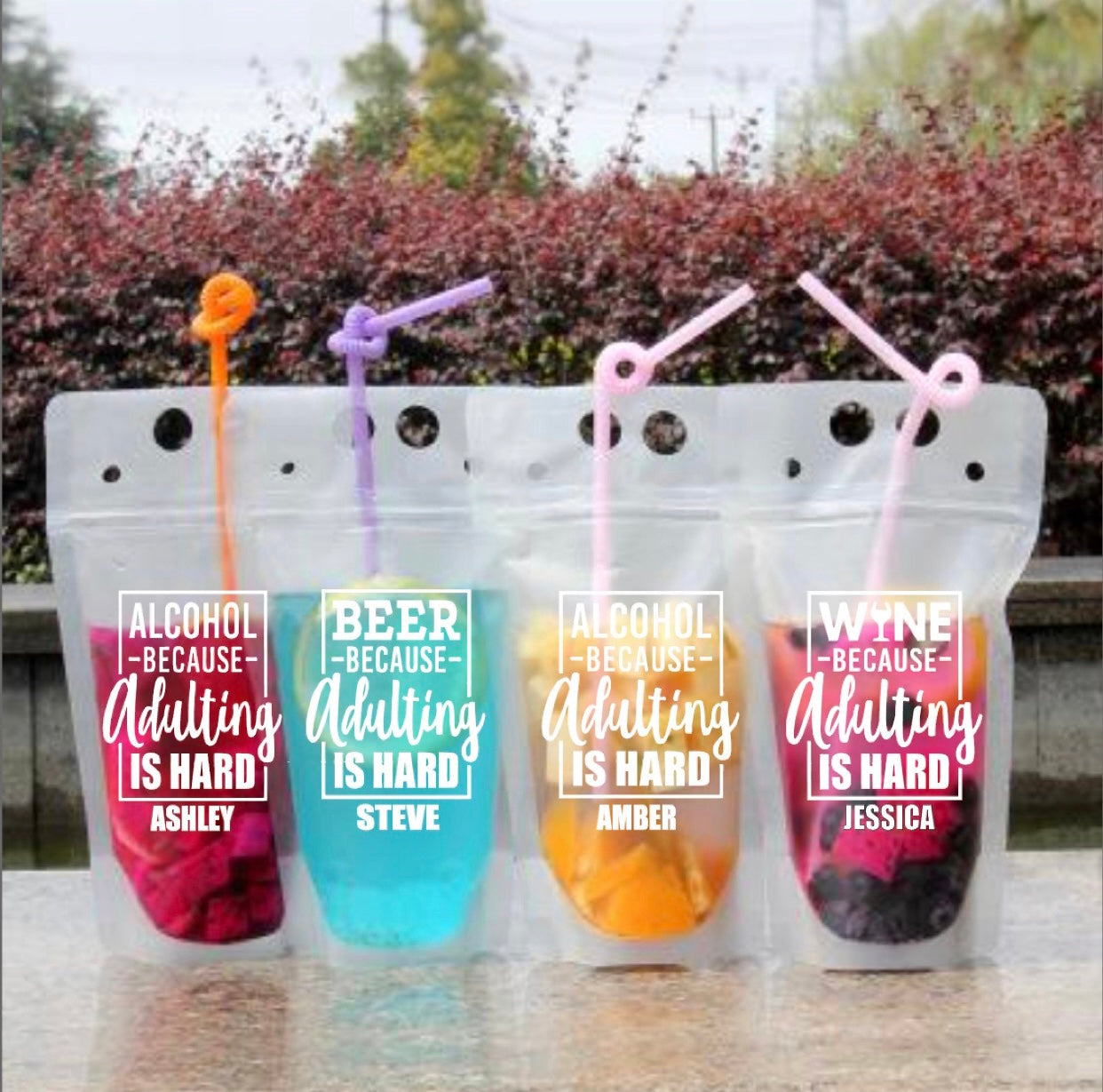 Kids shouldn’t have all the fun! We’ve got a fun adult version of a drink pouch which contains any of our delicious Signature Cocktails. These drink pouches that include a straw, can be taken to the beach, lake, pool, cabin, dinner, BBQ, or just to have at home!