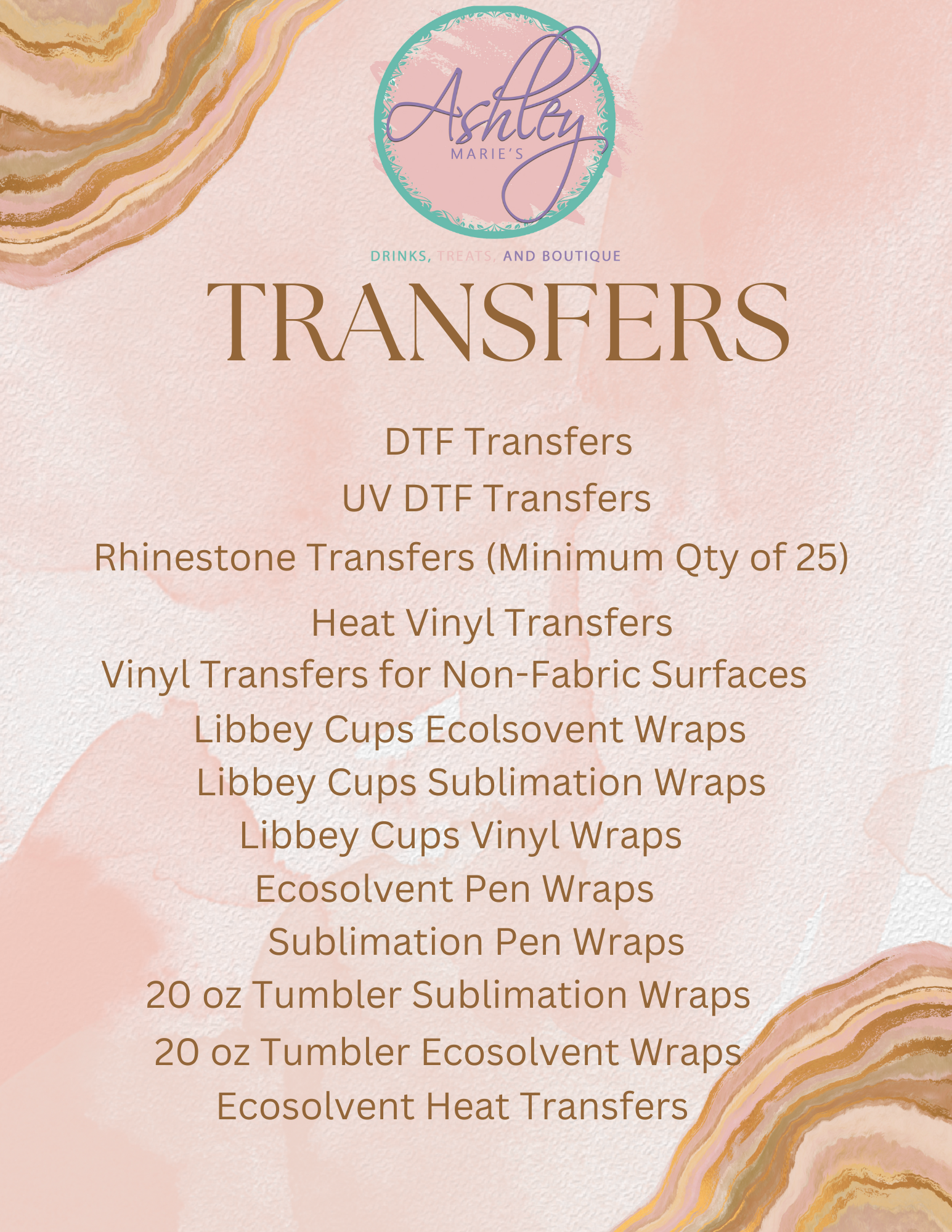 Not only do we carry cute designs, but you can also upload your own custom images. Our transfers are a easy way to increase your productivity, by saving you tons of time. Plus our transfers are of high quality so you and your customers will love them.