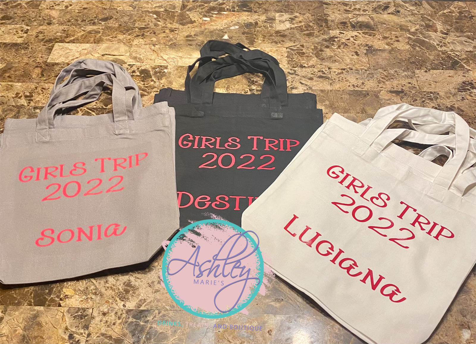 Add our personalized totes đ as an accessory to your trip! We offer various tote bag colors and designs. Choose your tote bag color. Indicate your personalization   (up to 3 lines of wording or an image and 1 line of wording) using the options below: