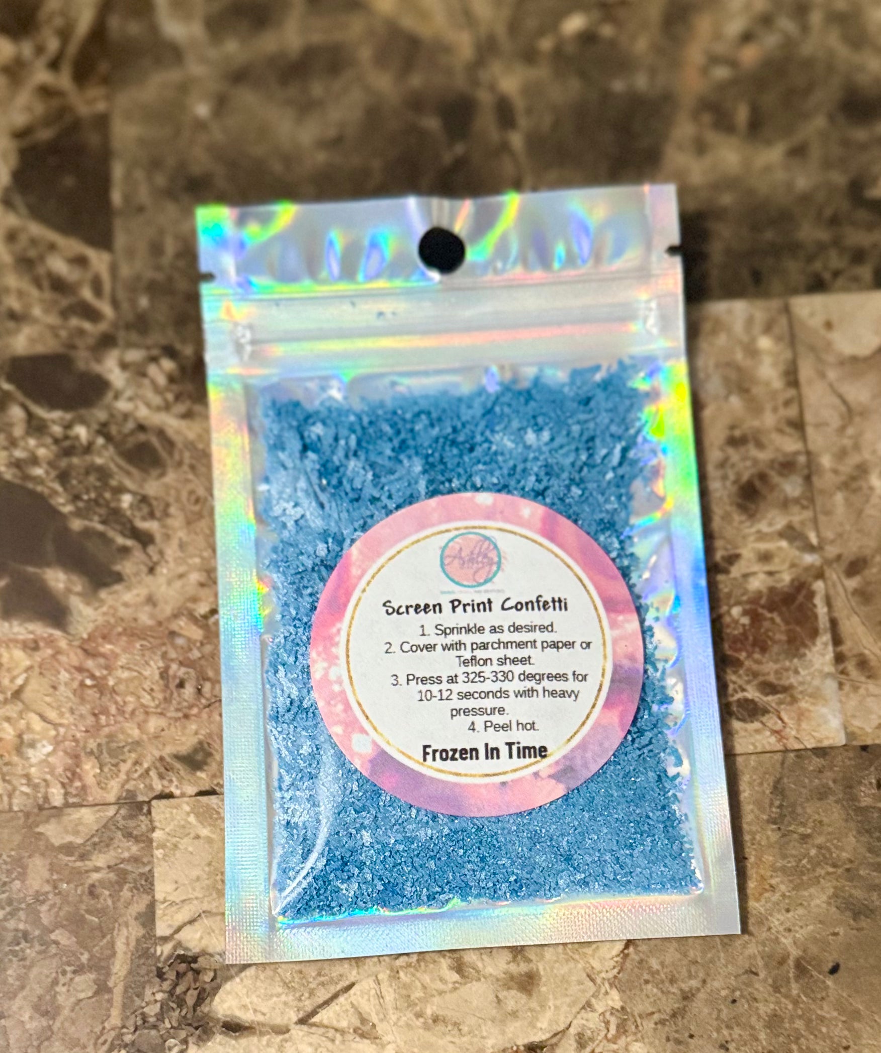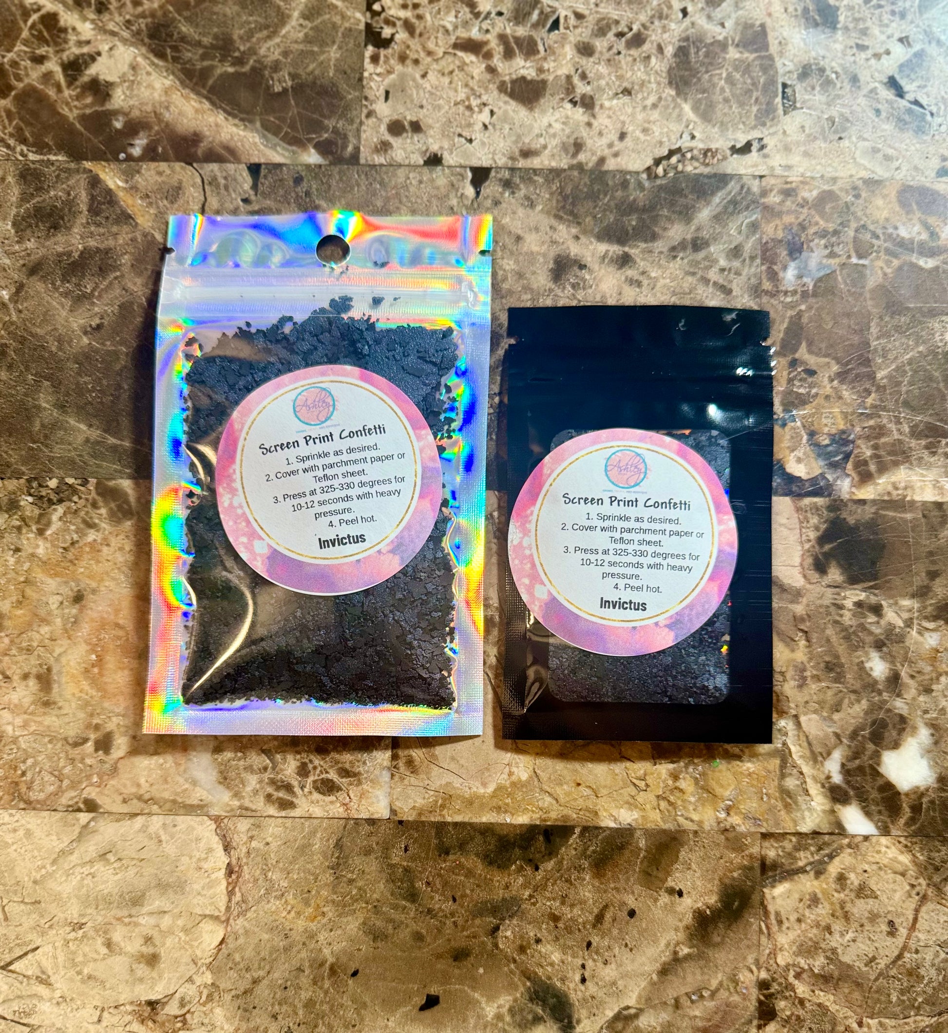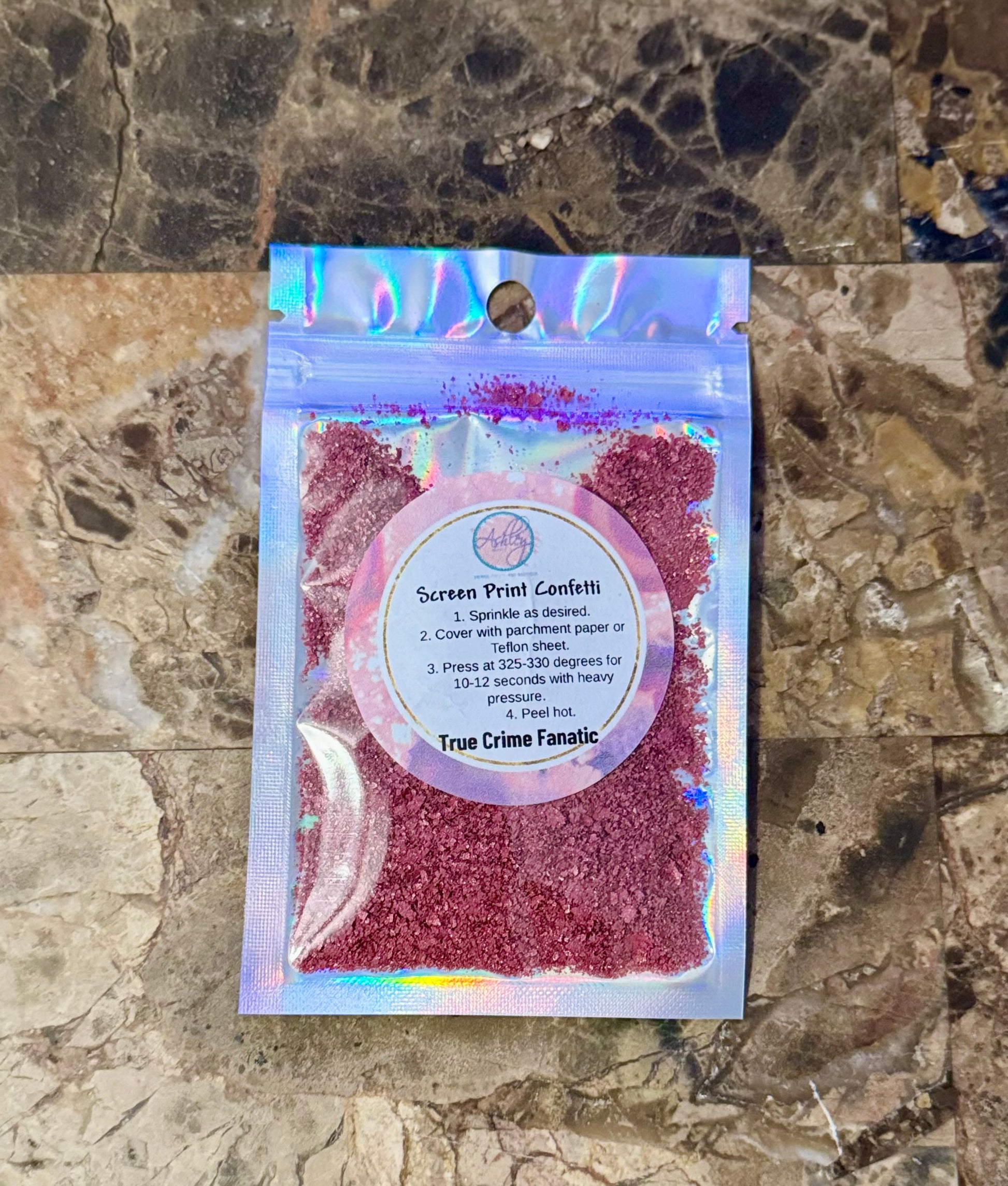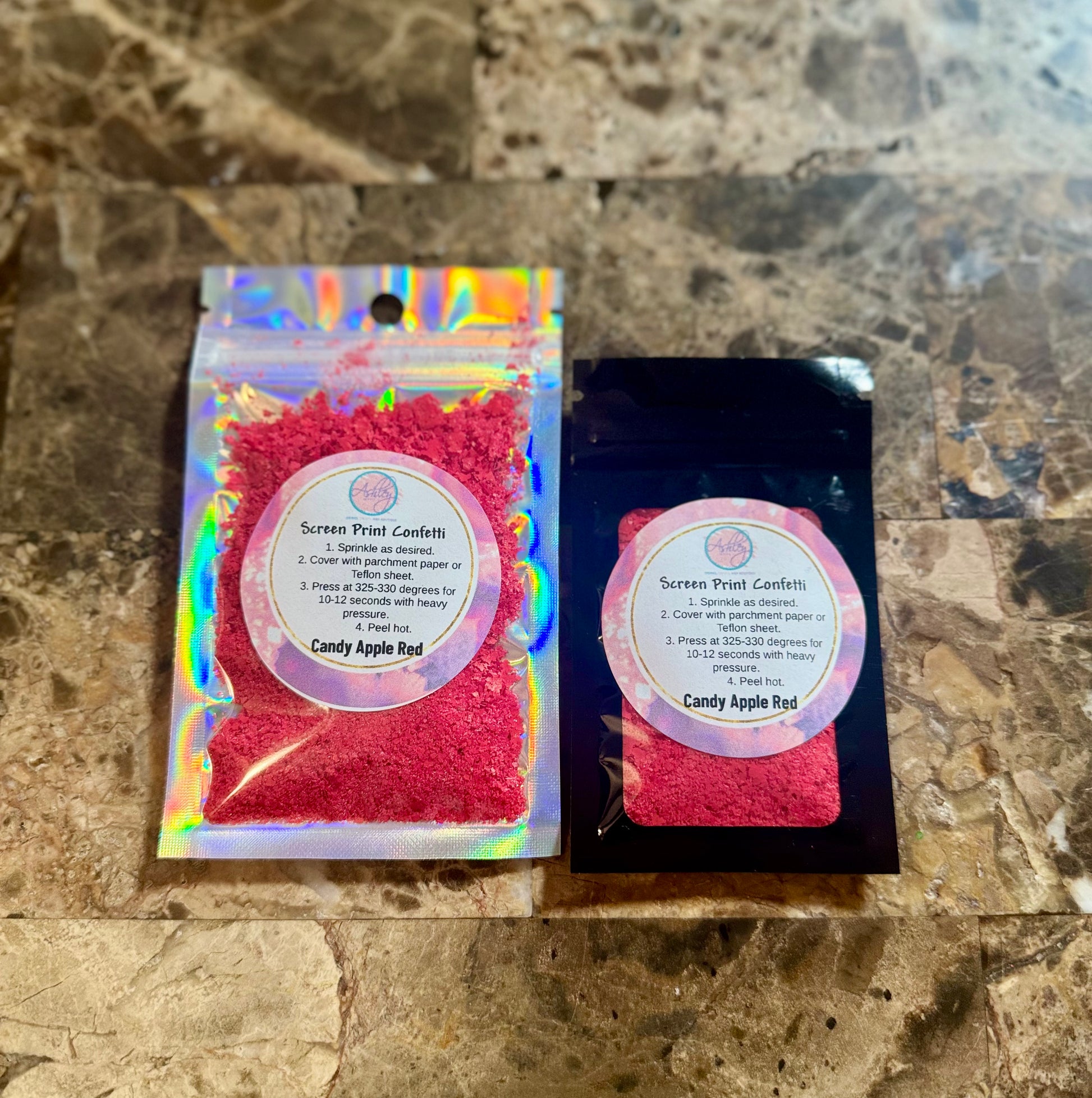 How to use: Sprinkle Screen Print Confetti after you press your image onto the garment. Sprinkle a little or sprinkle a lot then cover with parchment paper or a Teflon sheet. Please remember all heat presses are different, but we recommend Pressing at 325-350 degrees for 10-12 seconds with heavy pressure. Peel Hot. Some of the confetti will lift onto the cover sheet, so feel free to knock it off and press the garment again. (this is standard due to how the "confetti is made")