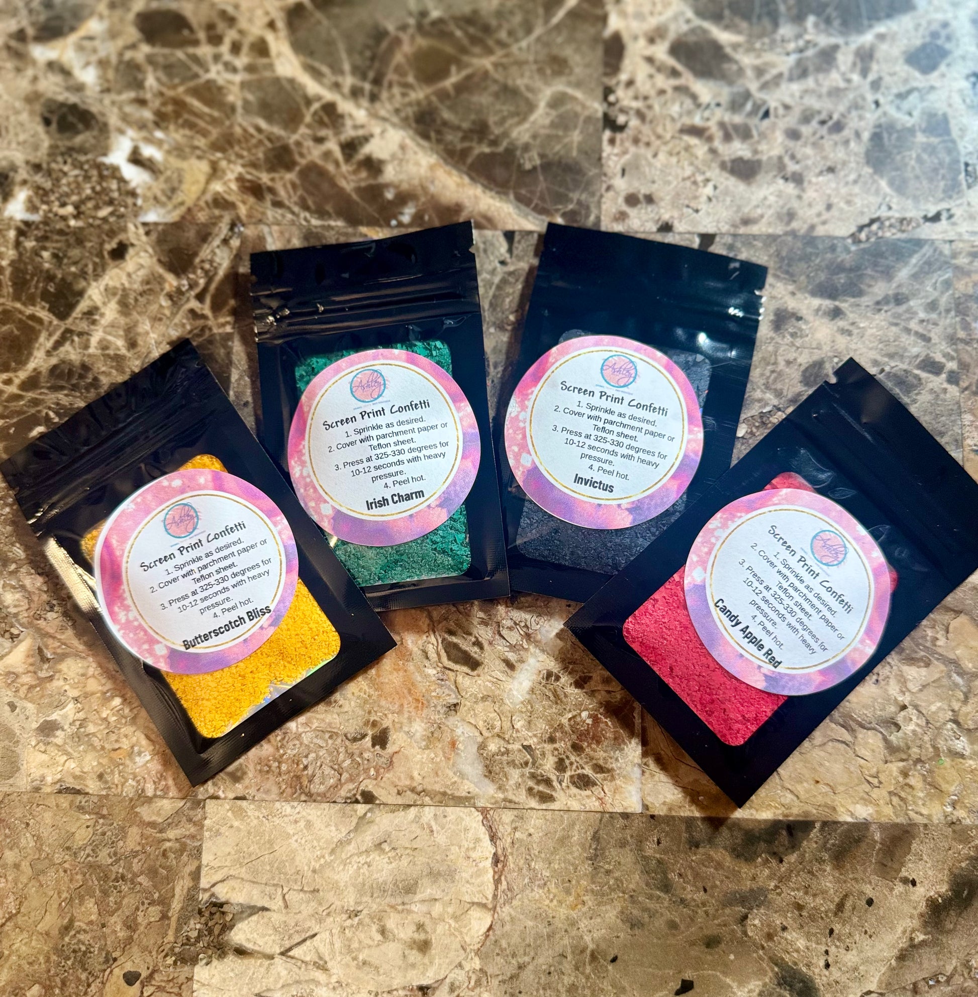 Not sure what color to choose of our Screen Print Confetti? Just want to try it out? Well our Screen Print Confetti Sample Pack is a great choice. Our Screen Print Confetti Sample Pack comes with 4 packs of our base colors and 1 pack of our specialty color blends, all of which are chosen at random.